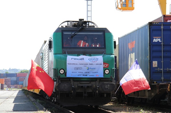 Le 23 juin, un train de fret Chine-Europe chargé de fournitures médicales arrive à Valenton, dans le sud-est de Paris. (Photo : Xinhua)