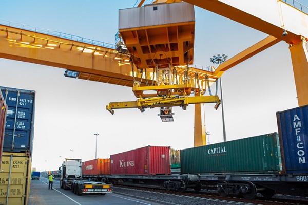Le 14 avril, les conteneurs d'un train de fret Chine-Europe de China Post sont transbordés à Vilnius, la capitale de la Lituanie. (Photo : Xinhua)