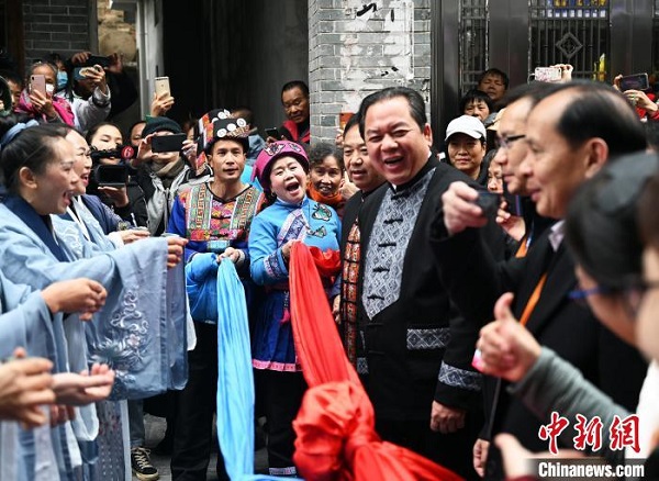 Des femmes en costumes de l'ethnie Yao font un défilé au xian autonome Yao de Fuchuan, dans la région autonome Zhuang du Guangxi, le 30 novembre 2020. Diverses activités folkloriques ont été organisées lors d'un événement de promotion du tourisme et des produits agricoles locaux, attirant de nombreux visiteurs. (Photo : Service de presse chinois / Yang Zhixiong)