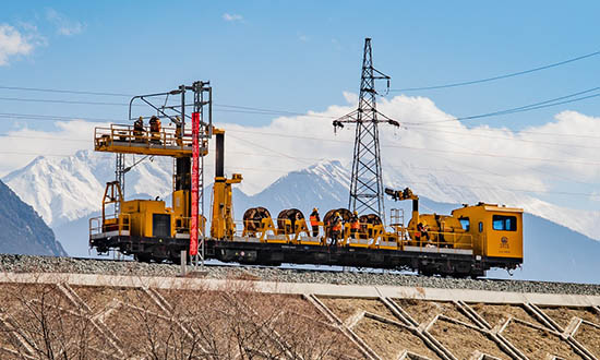 Une équipe de construction installe des lignes électriques pour le chemin de fer Lhassa-Nyingchi dans la région autonome du Tibet (sud-ouest de la Chine) en février. La ligne devrait ouvrir à la fin de cette année. (Ren Fuyang / Xinhua)