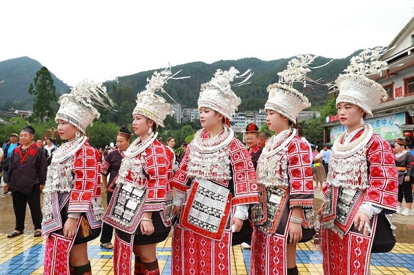 Des membres de l'ethnie Miao participent à la célébration du ? Liuyueliu ?, un festival ethnique, dans le comté de Jianhe de la préfecture autonome Miao et Dong de Qiandongnan, dans la province du Guizhou (sud-ouest de la Chine), le 23 juillet 2023. (Yang Wenbin / Xinhua)