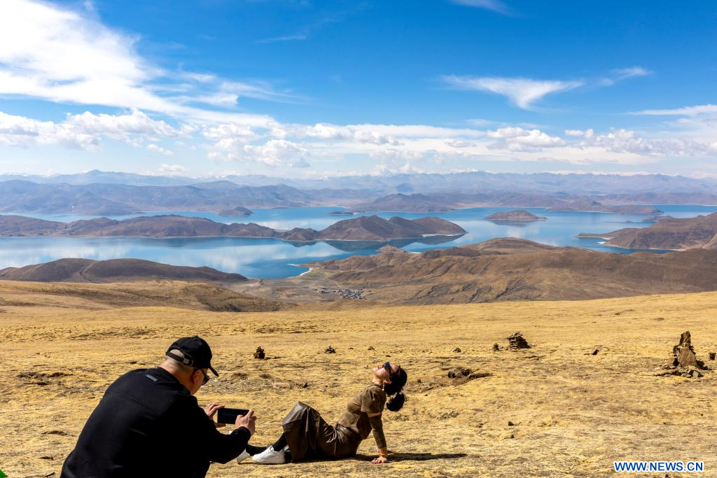 Une touriste pose pour une photo avec le lac Yamzbog Yumco en arrière-plan, dans la région autonome du Xizang (sud-ouest de la Chine), le 5 avril 2024. (Photo : Jiang Fan)