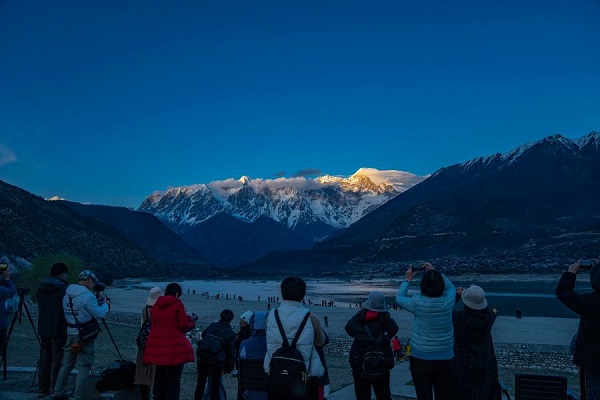 Des touristes prennent des photos du mont Namjagbarwa dans le village de Suosong à Nyingchi, dans la région autonome du Xizang, dans le sud-ouest de la Chine, le 1er avril 2024. (Photo : Sun Fei)