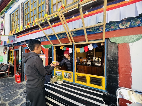 La grande cour de Kunsangtse abrite des maisons de style tibétain centenaires, qui conservent leur charme d'antan tout en affichant une vitalité renouvelée. Tenzin Tejue, qui a grandi dans cette cour, gère aujourd'hui avec des amis un café situé au coin nord-ouest du rez-de-chaussée. L'ar?me du café embaume l'air, et les clients vont et viennent, insufflant une nouvelle vie à cet ancien lieu. Pour que le café s'harmonise avec le charme historique de la cour, Tenzin a spécialement apporté de vieux objets de chez lui, tels que des tasses à thé anciennes, des tables et un vieux téléviseur. Au centre de la cour, des tables et des bancs sont soigneusement disposés pour permettre aux résidents de se reposer et de discuter. Sous le soleil, les ar?mes de tsampa et de thé sucré se mêlent aux chaleureuses conversations quotidiennes, créant une ambiance empreinte de douceur et de sérénité.