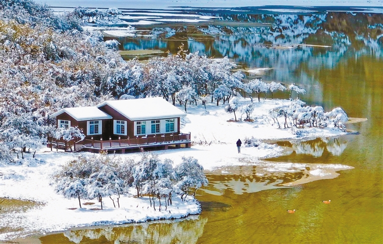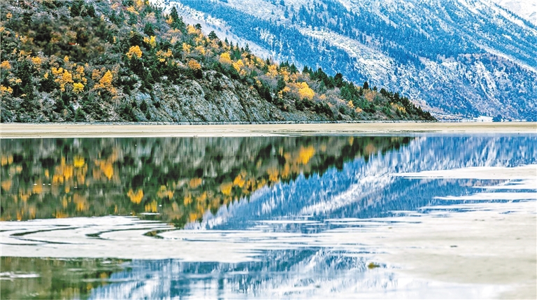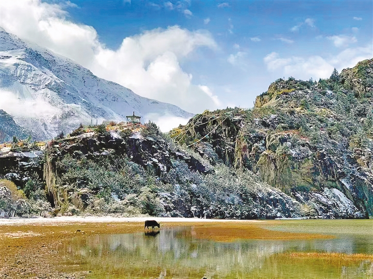 L'hiver à Qamdo est un véritable festin visuel. Lorsque les flocons de neige tombent doucement, recouvrant les montagnes majestueuses et le paisible lac Ra'og, le paysage se transforme en une toile colorée peinte par la nature. Le lac aux trois couleurs, dissimulé sous son manteau de neige immaculé, dévoile une beauté mystérieuse, telle un voile léger qui amplifie son charme énigmatique. Le temple de Tsedrup, quant à lui, avec ses toits dorés sous la neige et ses murs rouges drapés de blanc, semble figé dans le temps, offrant un spectacle saisissant.
