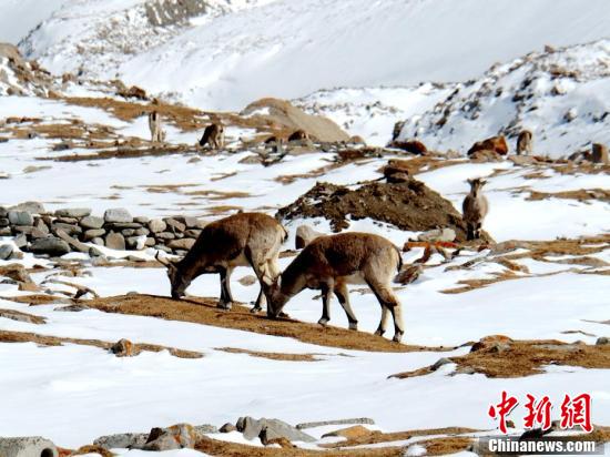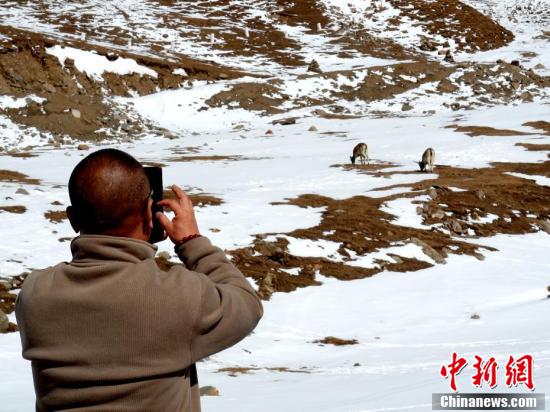 En mars, au pied des pics enneigés de Gangshka, situés dans le comté autonome hui de Menyuan, dans la préfecture autonome tibétaine de Haibei, dans la province du Qinghai, des touristes s'arrêtent au lac Lianxin pour prendre des photos souvenirs. Ces dernières années, la gouvernance écologique au Qinghai s'est constamment améliorée, favorisant un environnement de plus en plus équilibré, des espèces sauvages tels que le bharal et le tétraogalle tibétain apparaissent fréquemment, offrant aux touristes la possibilité d'interagir de près avec la faune locale.