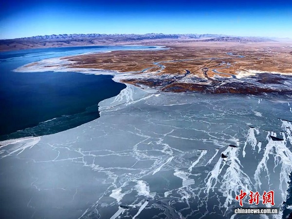 à l'occasion de la période de ? Grande Neige ?, un photographe a capturé par drone, dans le comté de Gangca, préfecture autonome tibétaine de Haibei, province du Qinghai, les premières formations de glace apparaissant à la surface bleu profond du lac Qinghai. Sous l'effet du vent, les floes oscillent doucement, évoquant des ? rubans de jade ? brisés.