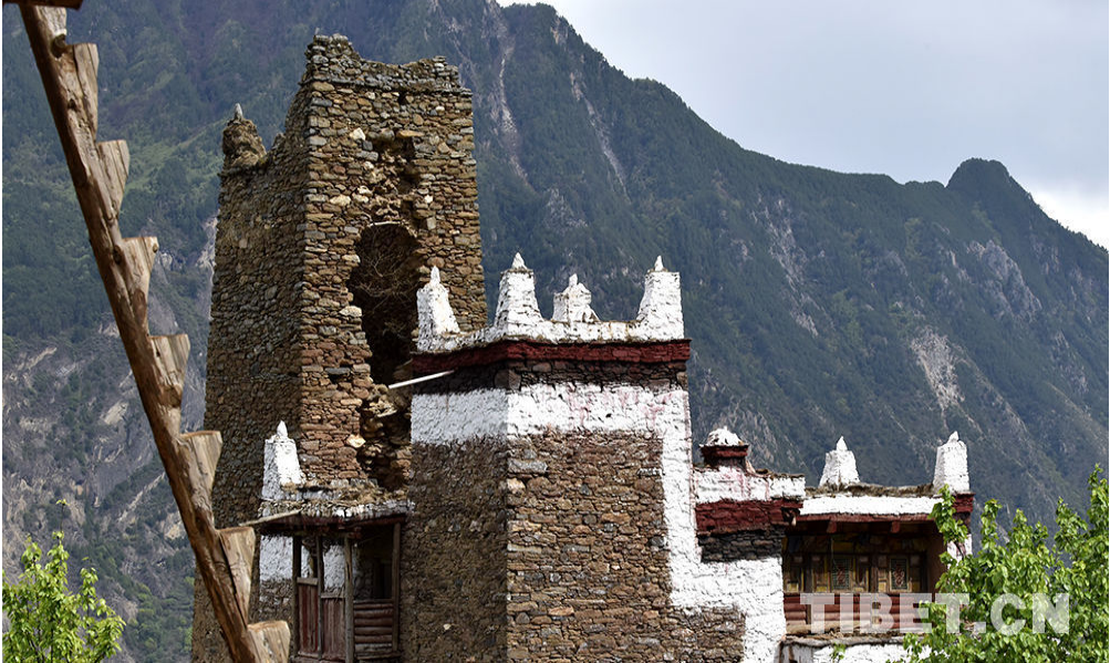 Les maisons dans le style tibétain. Les petites pagodes de pierre blanches dressées aux 4 coins du toit représentent les 4 dieux : la montagne, l'arbre, l'eau et le sol. Il s'agit d'un symbole important des coutumes populaires des Tibétains de Jiarong.
