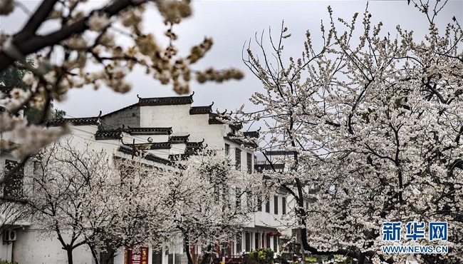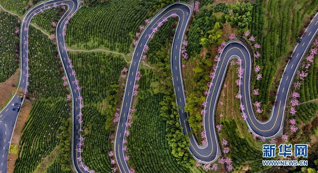 Photo aérienne prise le 2 mars, montrant les paysages printaniers d'un jardin de thé dans le xian de Chang'an, dans la province du Shaanxi (nord-ouest). Après une pluie de printemps qui est tombée lundi, les fleurs de pruniers, d'abricots et de cerisiers dans le jardin sont entrées en pleine floraison. (Photos: Tao Ming/Xinhua)