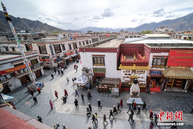 Barkhor, une rue commer?ante dynamique au c?ur de Lhassa, dans la région autonome du Tibet, a rouvert ses portes au public mardi après une fermeture temporaire suite à l'épidémie de COVID-19. La rue Barkhor, située non loin du temple de Jokhang, est surnommée ? la rue des saints ?, et est une des trois plus importantes rues de pèlerinage du Tibet. Photos prises le 28 avril 2020. (Photo: He Penglei/Chinanews)