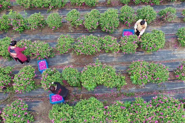 Des employées cueillent des roses dans une roseraie à Yangzhou, dans la province du Jiangsu (est de la Chine), le 4 mai 2020. (Photo / Xinhua)