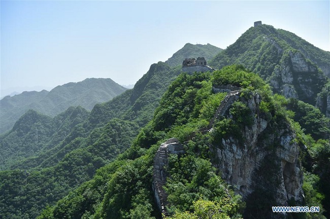Photo prise le 3 juin 2020, montrant une section de la Grande Muraille de Jiankou en cours de restauration dans le district de Huairou, à Beijing. (Chen Zhonghao / Xinhua)