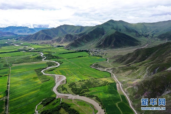 Photos aériennes prises le 14 juillet, montrant les paysages pittoresques du village de Lhunzhub, situé près de Lhassa, dans la région autonome du Tibet (sud-ouest). (Photos : Zhan Yan/Xinhua)