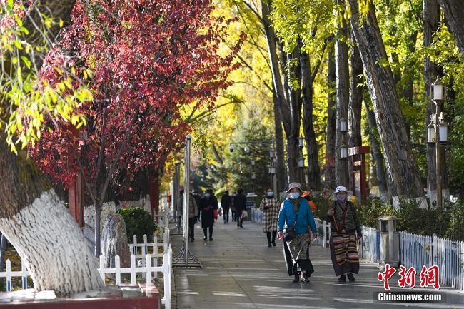 Le 17 novembre, dans le changement de saisons entre l'automne et l'hiver, le parc Dzongyab Lukhang, situé au pied du Palais du Potala à Lhassa, regorge de paysages colorés et agréables.