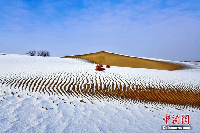 Une vague de froid a récemment atteint le désert du Taklamakan et s'est accompagnée de fortes chutes de neige. En tant que ? plus grand désert de Chine ?, le désert du Taklamakan, dans la région autonome ou?goure du Xinjiang (nord-ouest de la Chine), présente un paysage hivernal splendide. (Photos : Li Xiangwen/Chinanews)