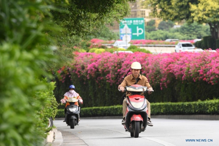 Des fleurs sont observées le long d'un pont à Nanning, dans la région autonome Zhuang du Guangxi (sud de la Chine), le 23 octobre 2021. (Xinhua/Lu Boan)