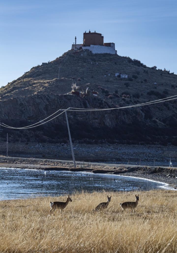 Photo prise le 10 janvier 2021 montrant des antilopes du Tibet en train de pa?tre près du temple Ritog, sur la rive nord du lac Yumzhog Yumco, dans la région autonome du Tibet (sud-ouest de la Chine). (Sun Fei / Xinhua)