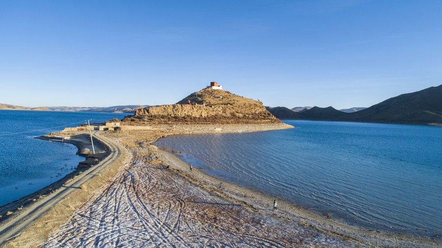 Photo prise le 9 janvier 2021 montrant le seul chemin menant au temple Ritog, sur la rive nord du lac Yumzhog Yumco, dans la région autonome du Tibet (sud-ouest de la Chine). (Sun Fei / Xinhua)