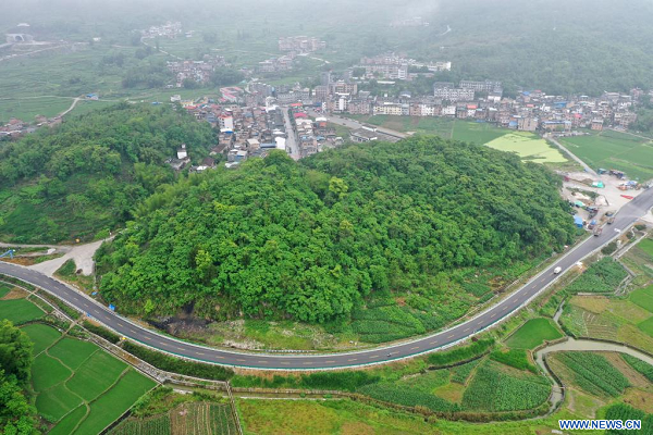 Photo prise le 12 mai 2022 montrant le paysage du bourg de Da'an dans le district autonome Maonan de Huanjiang, dans la région autonome Zhuang du Guangxi (sud). (Xinhua/Lu Boan)