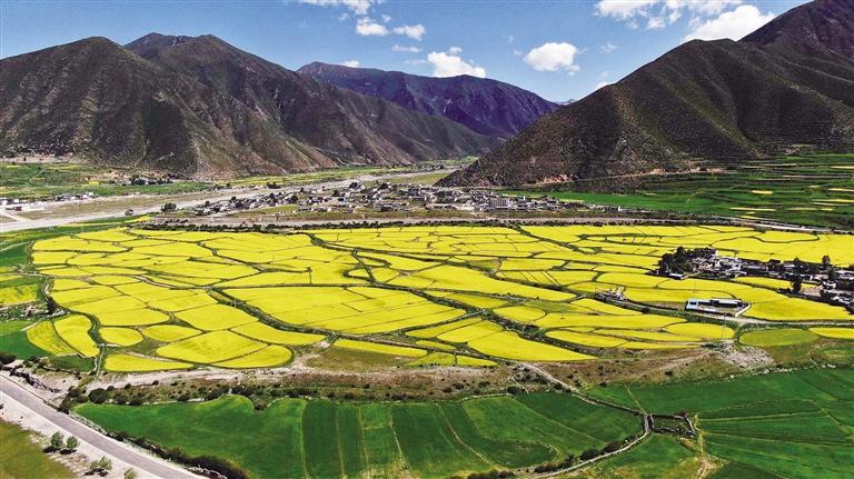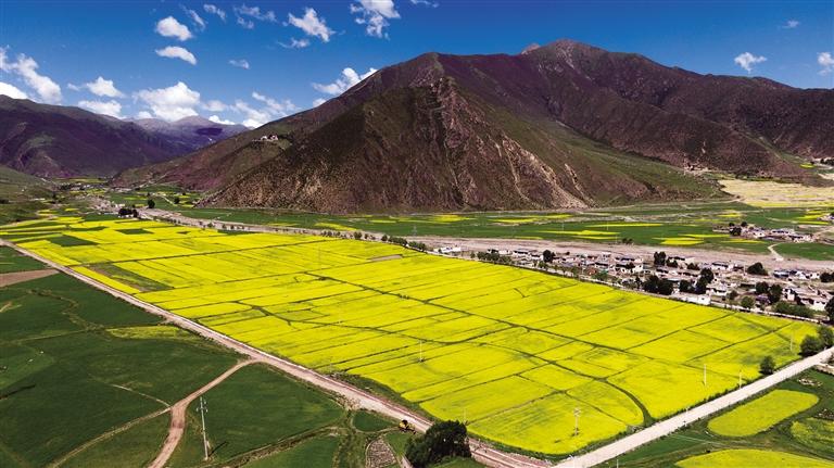 Juillet est la saison où les fleurs de colza fleurissent dans le district de Maizhokunggar, près de la ville de Lhassa. La terre semble être recouverte d'une couverture dorée, et les champs de colza et les montagnes verdoyantes forment un beau paysage rural.