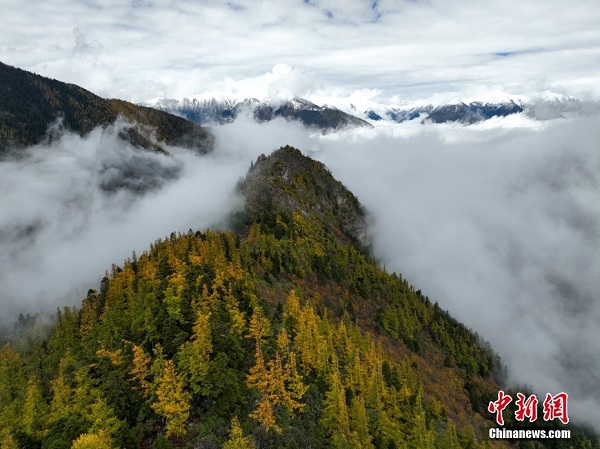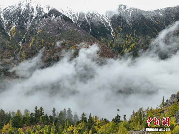 Le 26 octobre, une photographie aérienne de la montagne enneigée Doxong La au Tibet a été réalisée, et les montagnes enneigées et les forêts teintes formaient une magnifique image du haut plateau d'automne. La montagne enneigée Doxong La à Nyingchi, au Tibet, est située sur la crête principale dans la partie nord de l'Himalaya.