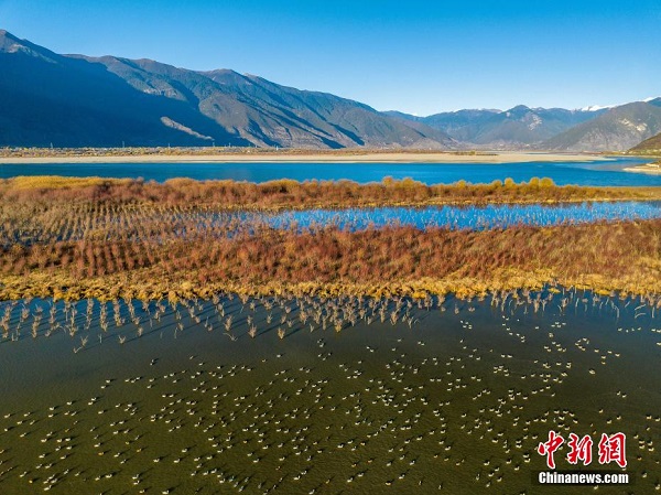 Le parc national des zones humides Yani au Tibet est situé au confluent de la rivière Yarlung Zangbo et de la rivière Nyang, dans le comté de Mainling et le district de Baiyi de la ville de Nyingchi, connu comme le ? Jiangnan sur les terres enneigées ?. Il s'étend sur une superficie totale de 8738 hectares. Récemment, le parc présente un paysage magnifique où l'eau et le ciel sont de la même couleur au début de l'hiver. Des oiseaux migrateurs se reposent et se nourrissent en groupes autour des terres humides. Au loin, les montagnes enneigées des deux c?tés de la rivière Yarlung Zangbo et de la rivière Nyang ajoutent à ce beau paysage plus de charme. Tout cela créé une scène harmonieuse et merveilleuse.