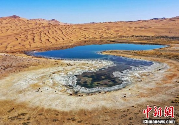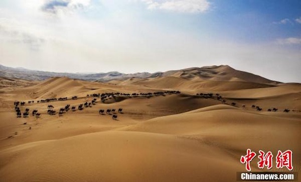 En hiver, les bergers de la ligue d'Alxa, dans la région autonome de Mongolie intérieure (nord de la Chine), munis de nourriture et d'eau potable, parcourent le désert à moto pour récupérer les chameaux rassemblés dans le désert de Badain Jaran au printemps et en été. Après que les bergers ont identifié leurs chameaux, ils les transfèrent à la ferme d'hiver, afin de restaurer l'écologie des paturages du désert.