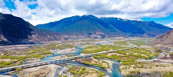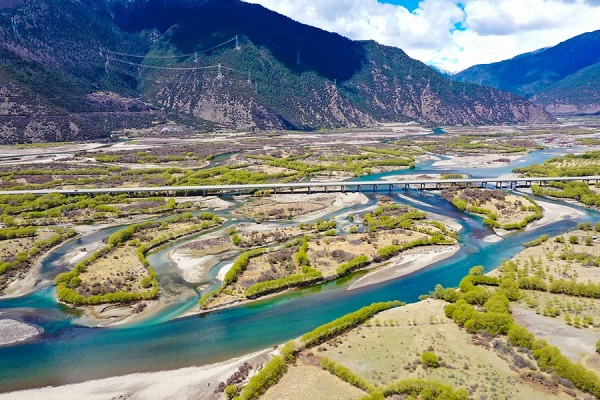 Photo aérienne du paysage printanier du parc national de la zone humide de Yani, à Nyingchi, dans la région autonome du Tibet (sud-ouest de la Chine), le 7 avril 2023. (Photo : Tian Jinwen)