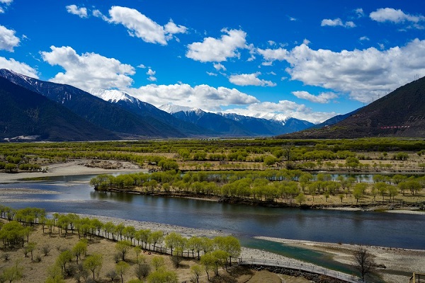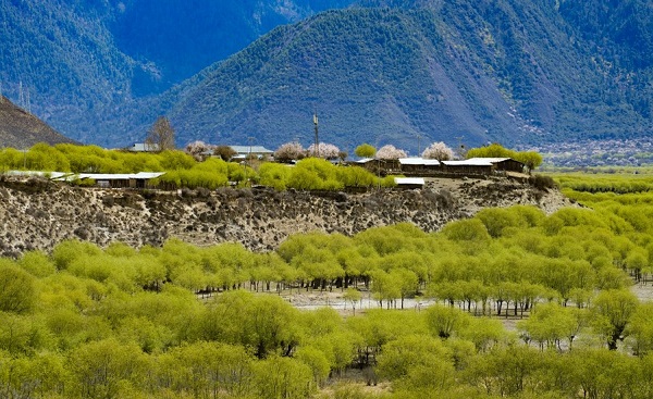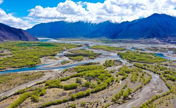 Photo aérienne du paysage printanier du parc national de la zone humide de Yani, à Nyingchi, dans la région autonome du Tibet (sud-ouest de la Chine), le 7 avril 2023. (Photo : Chen Shangcai)