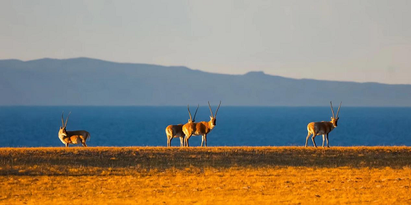 En photo : Groupe d'antilopes tibétaines au bord du lac de Serling