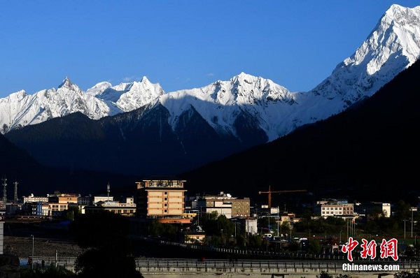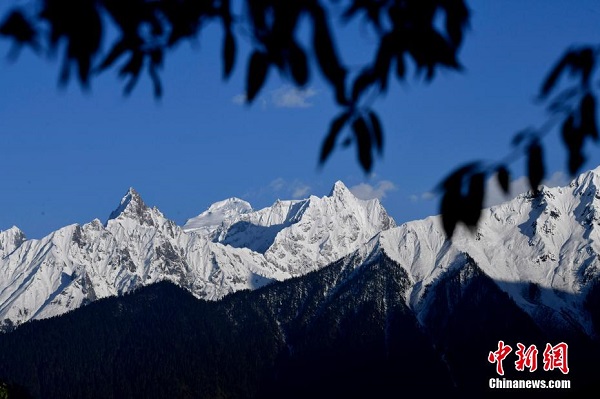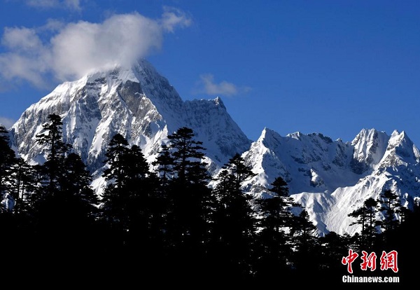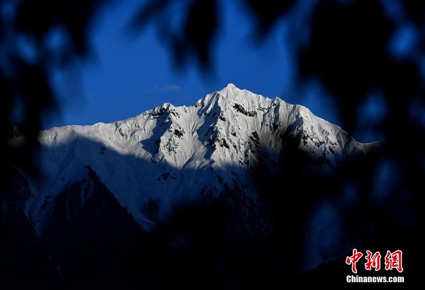 En photo : Paysage des montagnes enneigées dans le district de B?me, au Tibet.