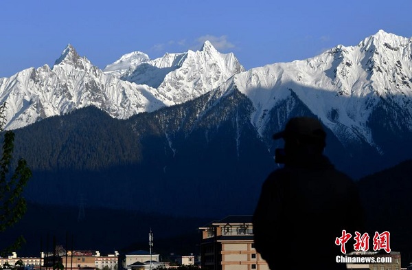 En photo : Un touriste prenant des photos du paysage des montagnes enneigées dans le district de B?me, au Tibet.