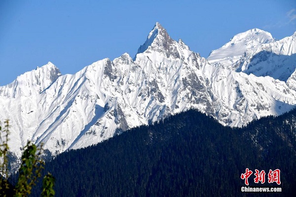 En photo : Paysage des forêts vierges et des montagnes enneigées dans le district de B?me, au Tibet.