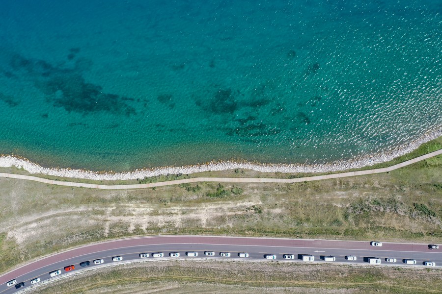 Des véhicules attendent d'entrer sur le site pittoresque du lac Sayram, dans la préfecture autonome mongole de Bortala de la région autonome ou?goure du Xinjiang, dans le nord-ouest de la Chine, le 25 juillet 2023. (Photo : Ding Lei)