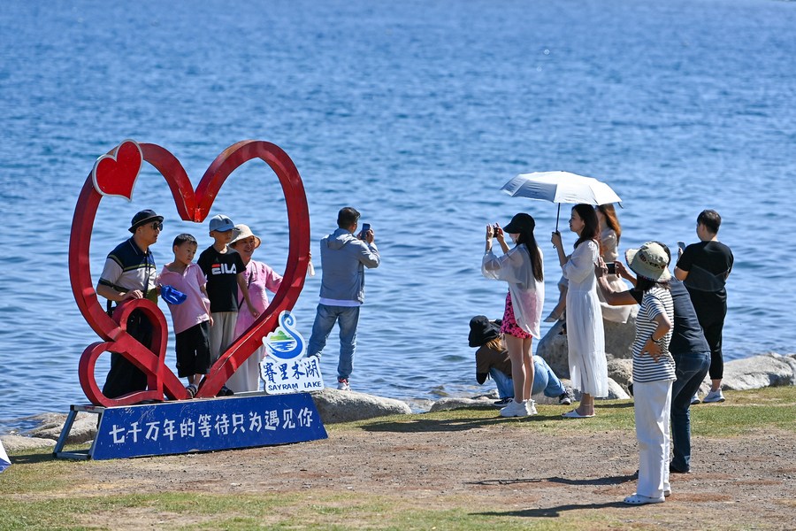 Des touristes visitent le lac Sayram dans la préfecture autonome mongole de Bortala de la région autonome ou?goure du Xinjiang, dans le nord-ouest de la Chine, le 25 juillet 2023. (Photo : Ding Lei)
