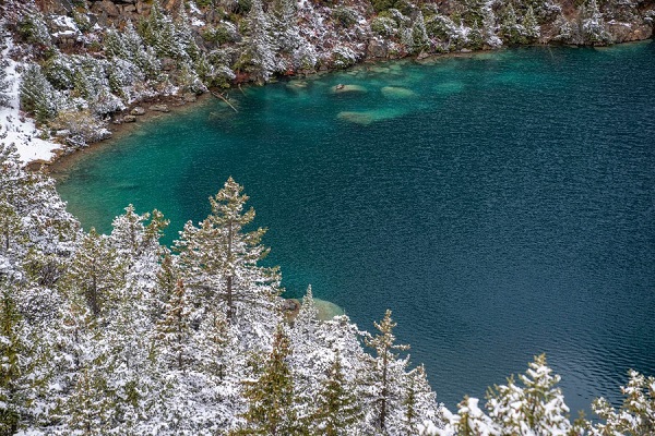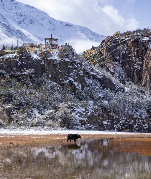 Le "lac noir" des "lacs tricolores" dans le village de Puyu du district de Banbar, à Qamdo, dans la région autonome du Tibet (sud-ouest de la Chine), le 27 octobre 2023. (Photo : Sun Fei)