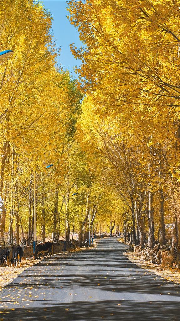 Les couleurs automnales du district de Dagzê ne se limitent pas aux terres agricoles : sa rivière en automne a aussi un aspect unique. Des feuilles dorées tombent sur la rivière, sont doucement transportées par la rivière, et les arbres au bord de la rivière se reflètent également dans son eau claire. Alors que l'eau ondule, un défilement d'images animées se déroule.