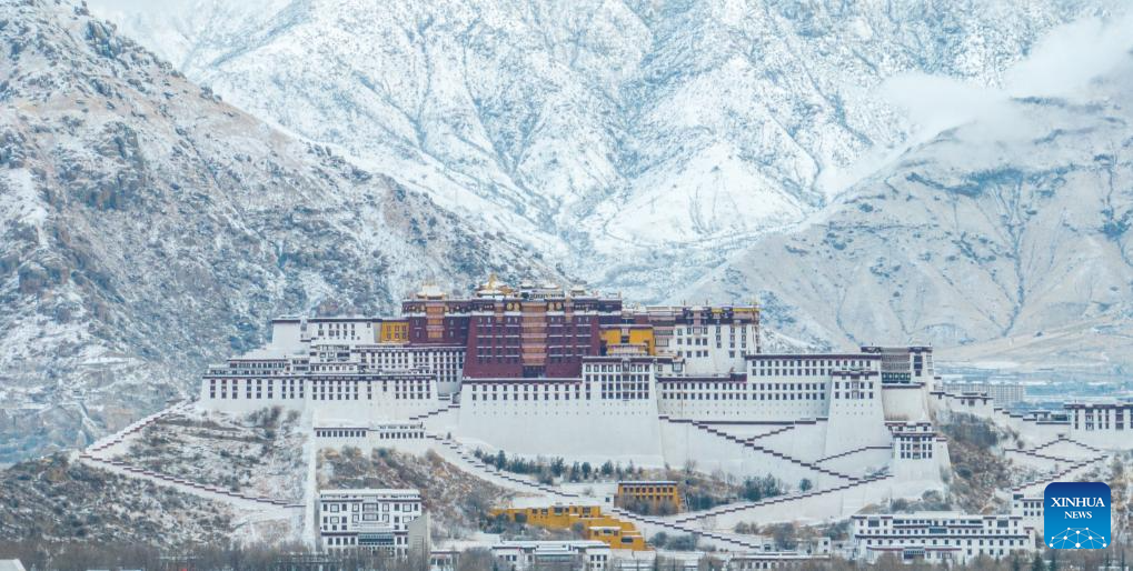 Photo aérienne prise par un drone le 16 février 2025 montrant le paysage enneigé du Palais du Potala à Lhassa, capitale de la région autonome du Xizang (sud-ouest de la Chine). (Tenzin Nyida / Xinhua)