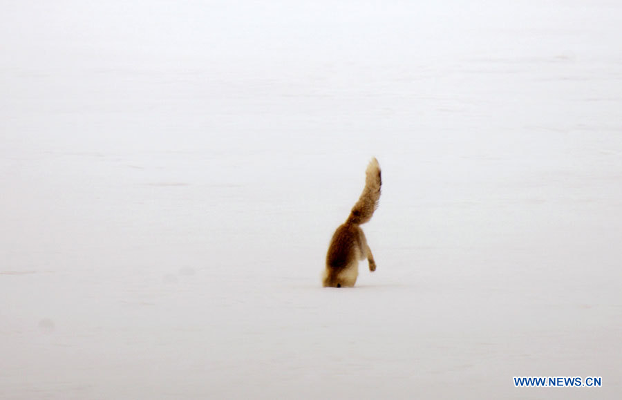 Un renard cherche de la nourriture sur un paturage enneigé dans le district de Burang, dans la région autonome du Tibet.