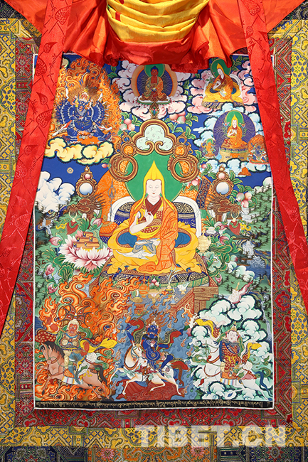 En photo : Thangka multicolore “Quatrième Panchen Lama Lobsang Ch?kyi Gyaltsen” qu’abrite le monastère de Tashilhunpo. à l’age de 13 ans, Lobsang Ch?kyi Gyaltsen (1570–1662) fut converti en bouddhisme au Monastère d'Angong. La cérémonie de désignation eut lieu au 2 février 1583, suite à laquelle il accéda au tr?ne Tripa, titre du ma?tre spirituel du bouddhisme tibétain, à l’age 14 ans.