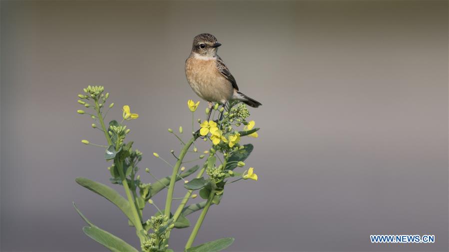 Un oiseau sur une fleur de colza au bourg de Shangjie du district de Minhou à Fuzhou, dans la province du Fujian (sud-est de la Chine), le 19 février 2019.