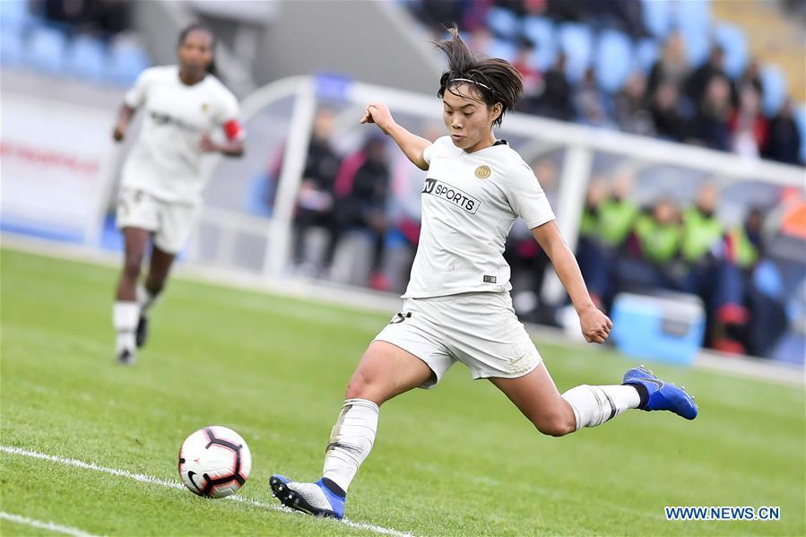 La footballeuse chinoise Wang Shuang, qui joue actuellement pour le club fran?ais du Paris Saint-Germain, tire lors d'un match opposant le Paris Saint-Germain-Lille, à Lille, le 13 janvier 2019. (Xinhua / Chen Yichen)