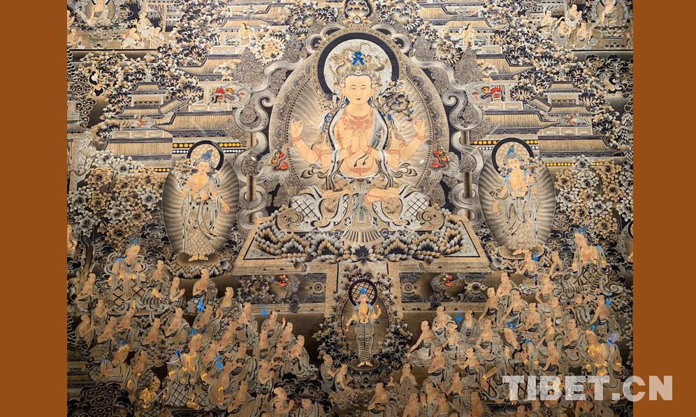 Le thangka coloré ? Manjushri ?, caractérisé par sa partie noire et dorée. De Niangben.