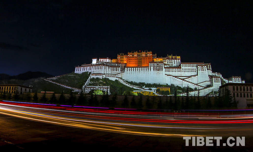 Un véhicule laisse des tracées colorées devant le Palais du Potala.