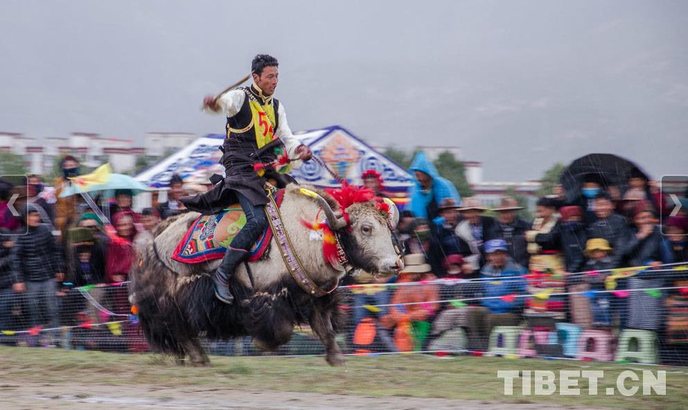 Récemment, le comté de Mozhugongka, situé à Lhassa dans la région autonome du Tibet, a organisé une course de yaks afin de célébrer le 70ème anniversaire de la fondation de la République populaire de Chine. à cette occasion, les bergers participants ont minutieusement habillé leurs yaks. Ils les ont montés avant de marcher sur la ligne de départ, l'air très confiant. Après le coup de feu de départ, les ? cavaliers ? se sont précipités vers la ligne d'arrivée. Les spectateurs criaient et acclamaient chaque yak au galop. Certains yaks désobéissants et l'apparente impuissance des ? cavaliers ? ont décha?né l'hilarité générale.