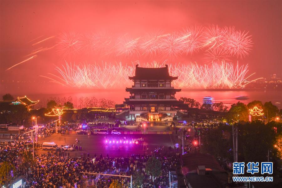 Des feux d'artifice illuminent le ciel au-dessus de l'?lot de Juzizhou, le 1er janvier 2020. Un spectacle du Nouvel An a été organisé mercredi soir à Changsha, chef-lieu de la province du Hunan (centre), attirant de nombreux visiteurs.