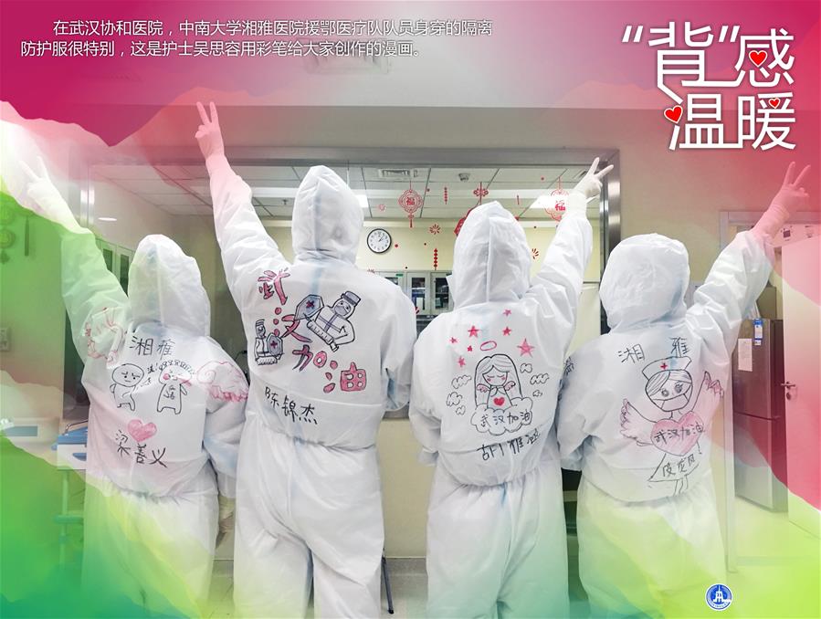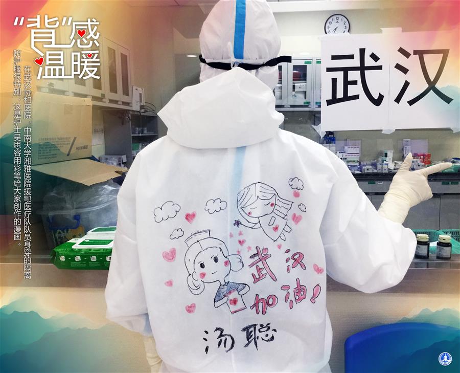 Voici une série de photos montrant des bandes dessinées réalisées par l'infirmière Wu Sirong sur les vêtements de protection des membres du personnel médical travaillant à l'H?pital de l'Université de l'Union et à l'H?pital Xiangya, à Wuhan.