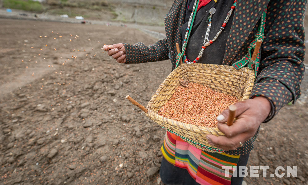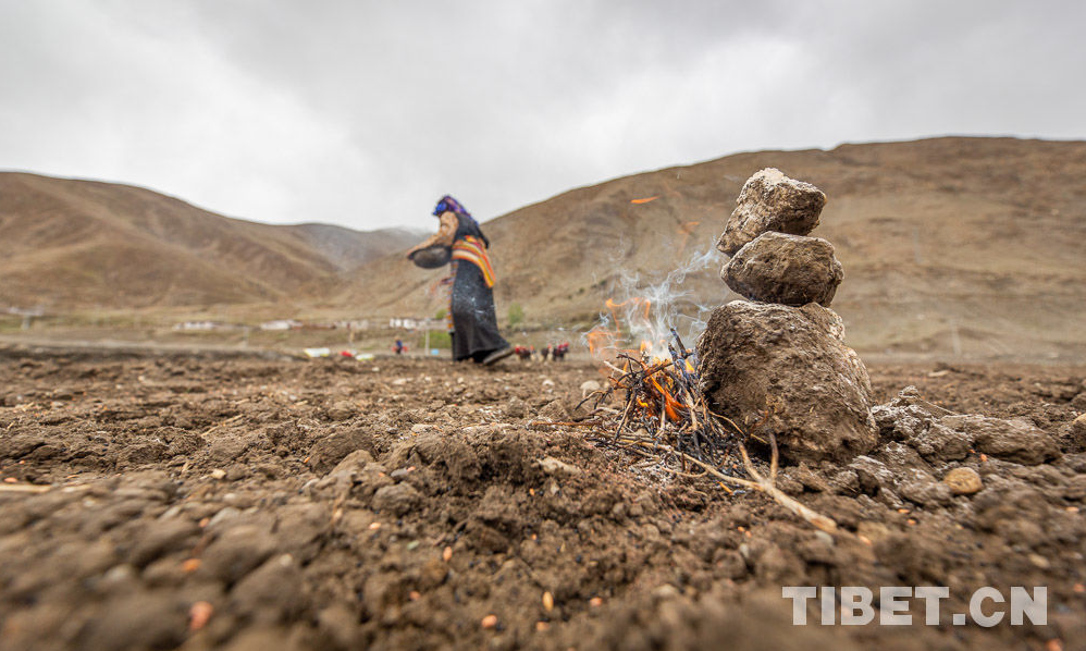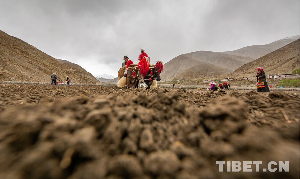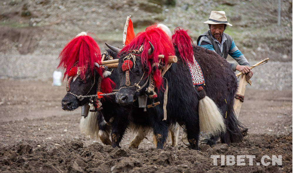 Sur place, on procède à un labourage par des machines modernes et à celui traditionnel par deux bovins qui se complètent. Les bruits de sonnailles et de machines résonnent dans les champs. Les villageois br?lent des branches de pin en signe de prières, sèment à la volée les grains d'orge tibétaine, répandent les engrais et labourent la terre, tout cela se déroulant avec le souhait d'une bonne récolte cette année.