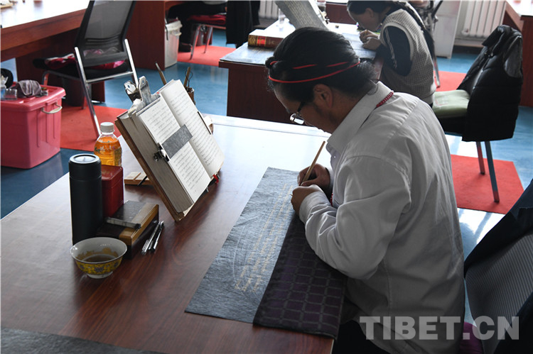 Un jeune peintre a déclaré au journaliste qu'il est originaire du comté de Jianzha. Il a appris à peindre dans son enfance. Plus tard, il a rejoint la société pour se charger du dessin d'illustration du manuscrit à l'encre dorée. Grace à la formation et à l'apprentissage, il a développé une compétence standardisée qui lui permet de mettre ses dons artistiques en pratique. "Je peux gagner 3000-5000 yuans par mois dans l'entreprise. Mon salaire est calculé sur les pièces dessinées. Mes collègues sont tous passionnés et enthousiastes au travail." a déclaré le jeune homme au journaliste alors qu'il travaillait.