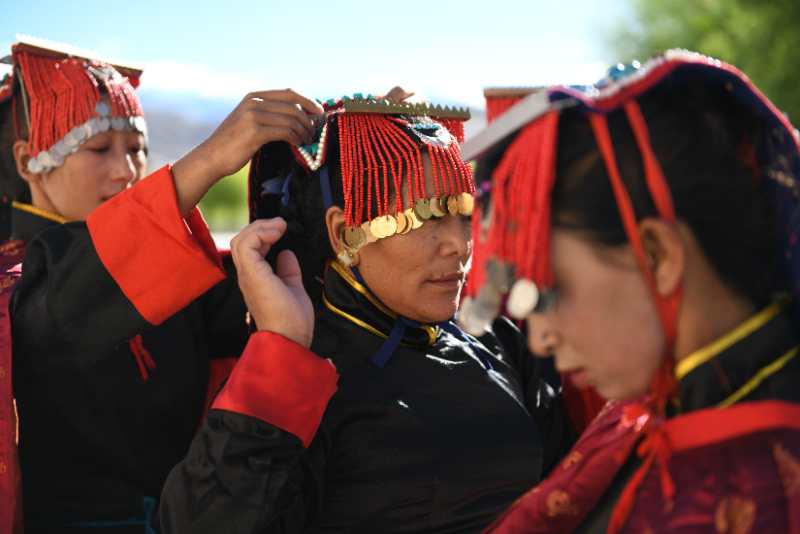 Les danseurs de la danse ? Xuan ? de la troupe d'art du district de Zanda triant leurs costumes.